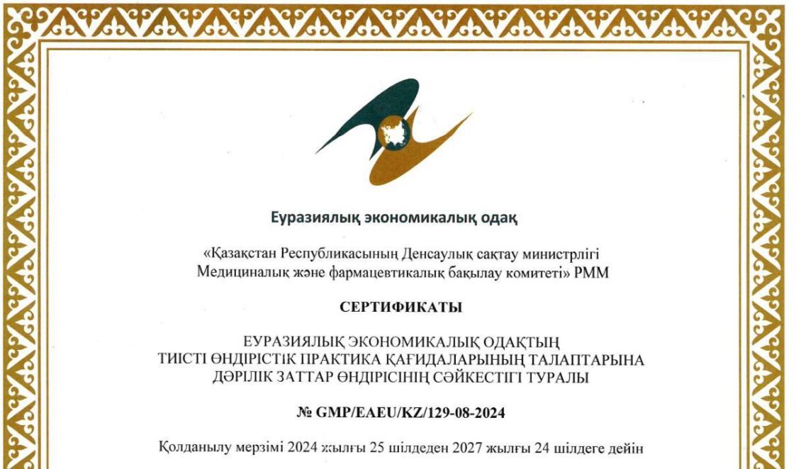 26 августа 2024ТИІСТІ ӨНДІРІСТІК ПРАКТИКА ЕРЕЖЕЛЕРІНІҢ (GMP)ТАЛАПТАРЫНА СӘЙКЕСТІГІ РАСТАЛДЫ