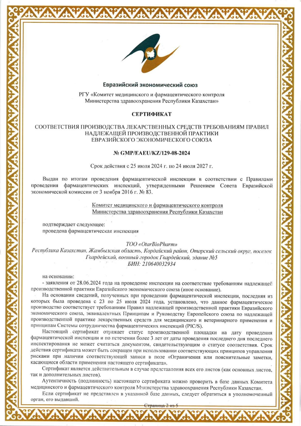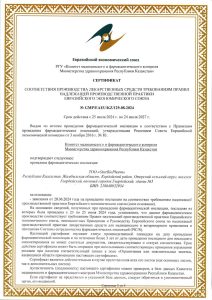 Сегодня Товарищество в очередной раз получило подтверждение соответсвия условий, созданных на биофармацевтическом заводе, требованиям стандарта надлежащих производственных практик (GMP) – Комитетом медицинского и фармацевтического контроля Министерства здравоохранения Республики Казахстан выдан Сертификат соответствия производства лекарственных средств требованиям правил надлежащей производственной практики Евразийского Экономического Союза №GMP/EAEU/KZ/129-08-2024.